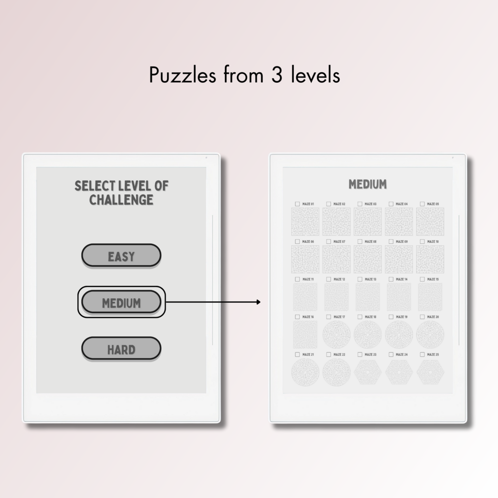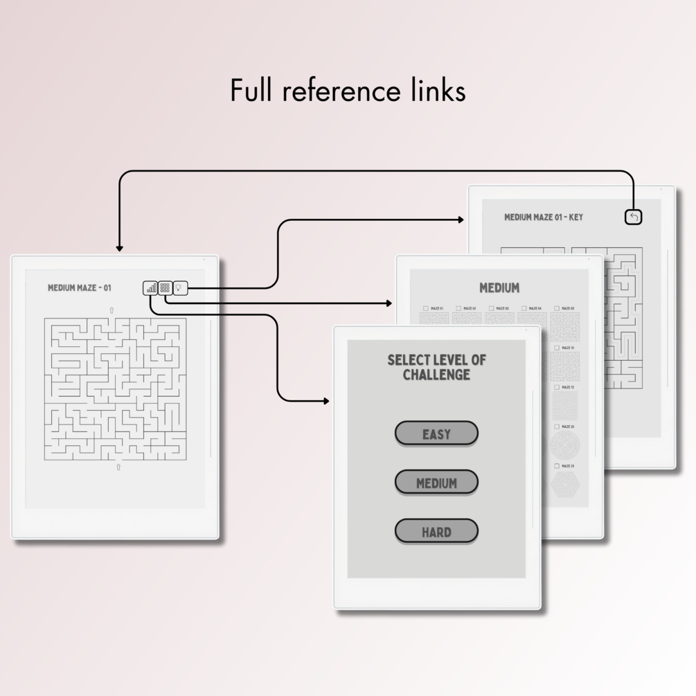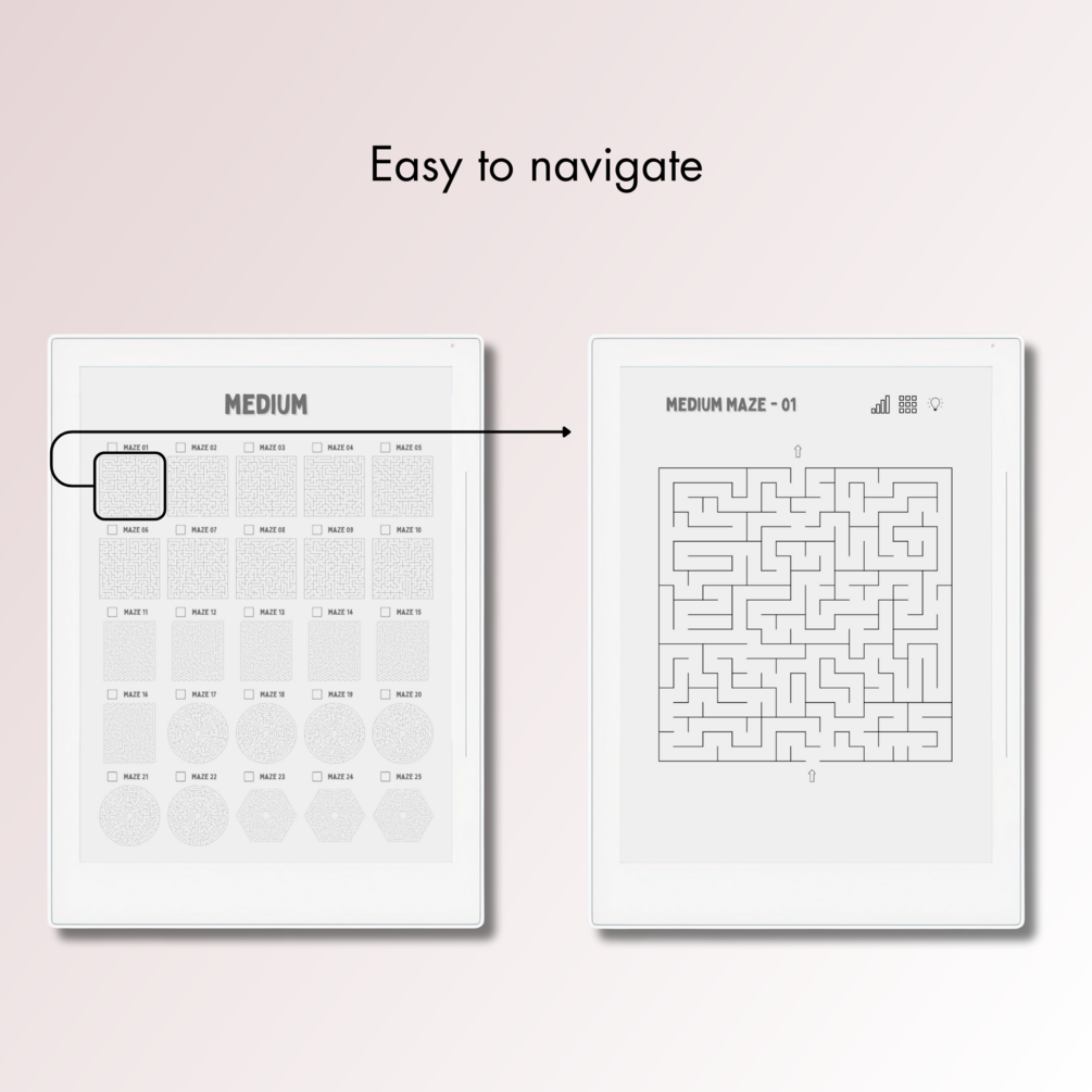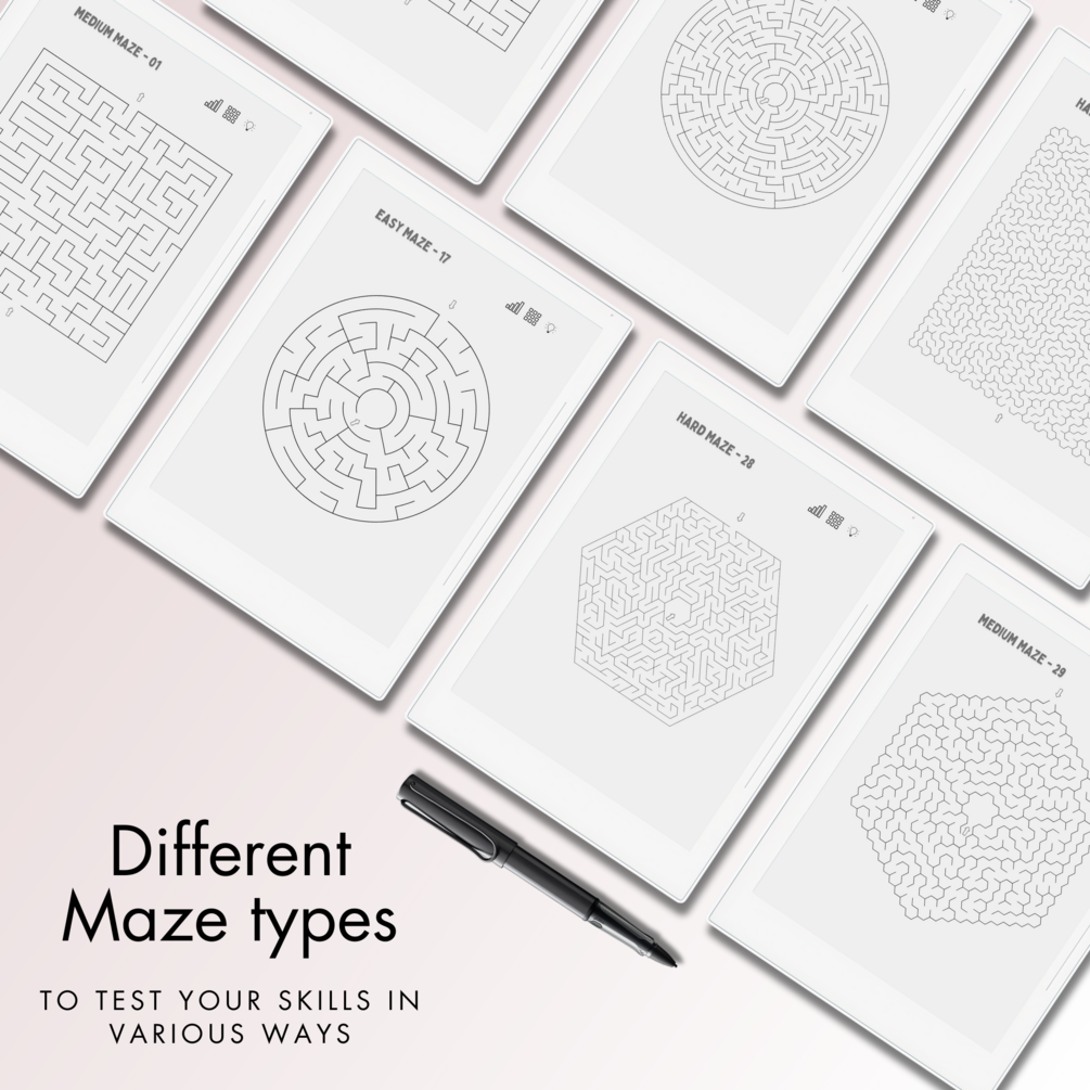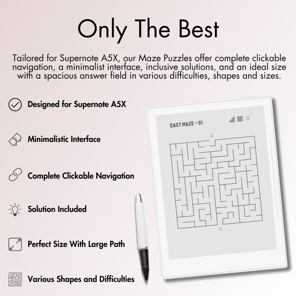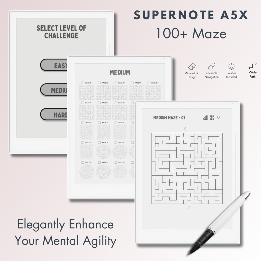 This is a Digital Download of 100+ Maze Puzzles in 3 different levels tailored for Supernote A5X. Our Maze Puzzles offer complete clickable navigation, a minimalist interface, inclusive solutions, and an ideal size with a spacious answer field for Supernote A5X E-Ink screen.