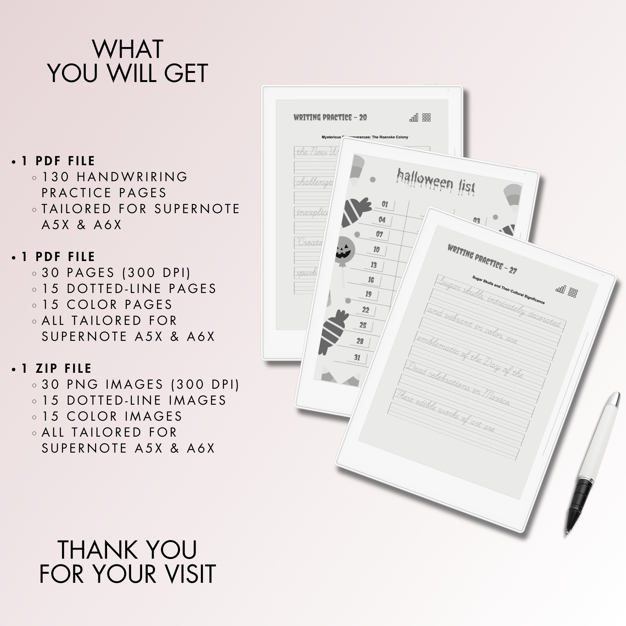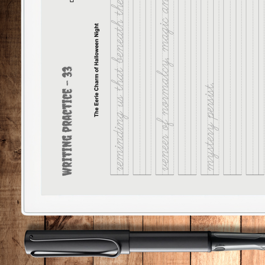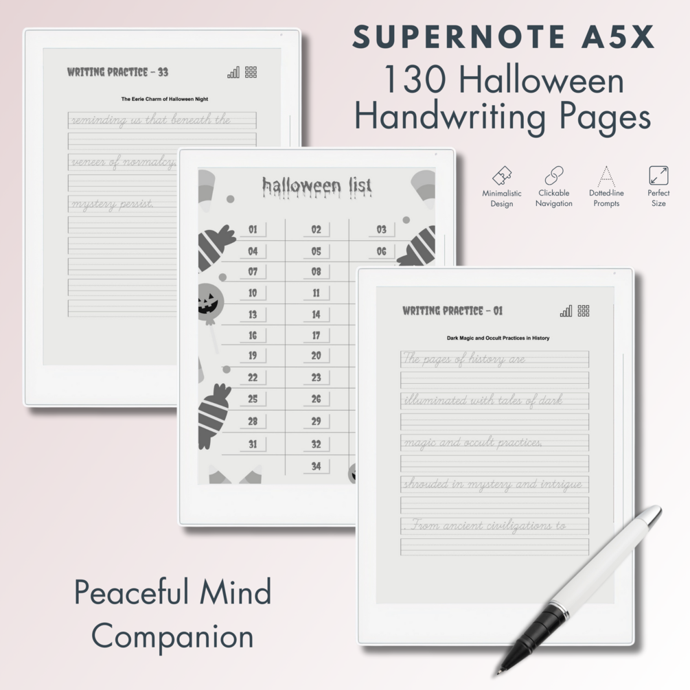 This is a Digital Download of Halloween-theme Handwriting Dotted-line Pages tailored for Supernote A5X. Indulge in the essence of Halloween with our meticulously crafted Digital Product. Experience the captivating atmosphere as you immerse yourself in the world of enhanced writing precision. Engage with stimulating writing prompts, all within effortless reach through digital accessibility. Tailored for adult learners, our collection is a celebration of refinement in penmanship and creativity.